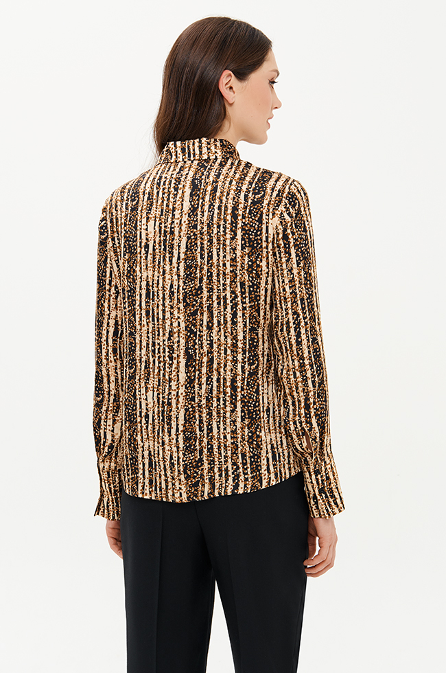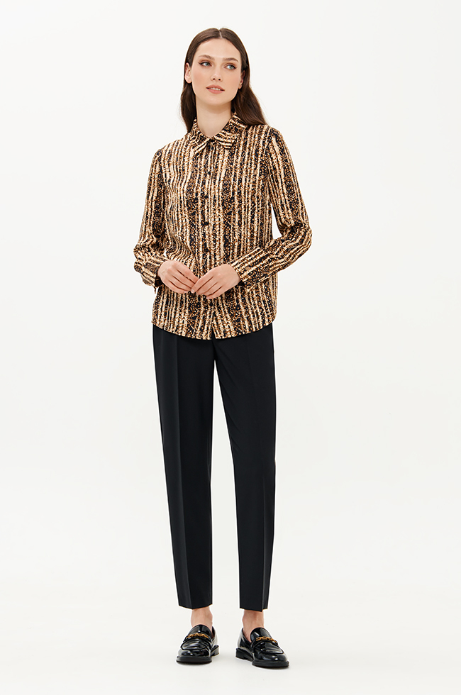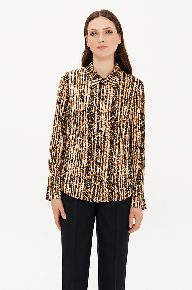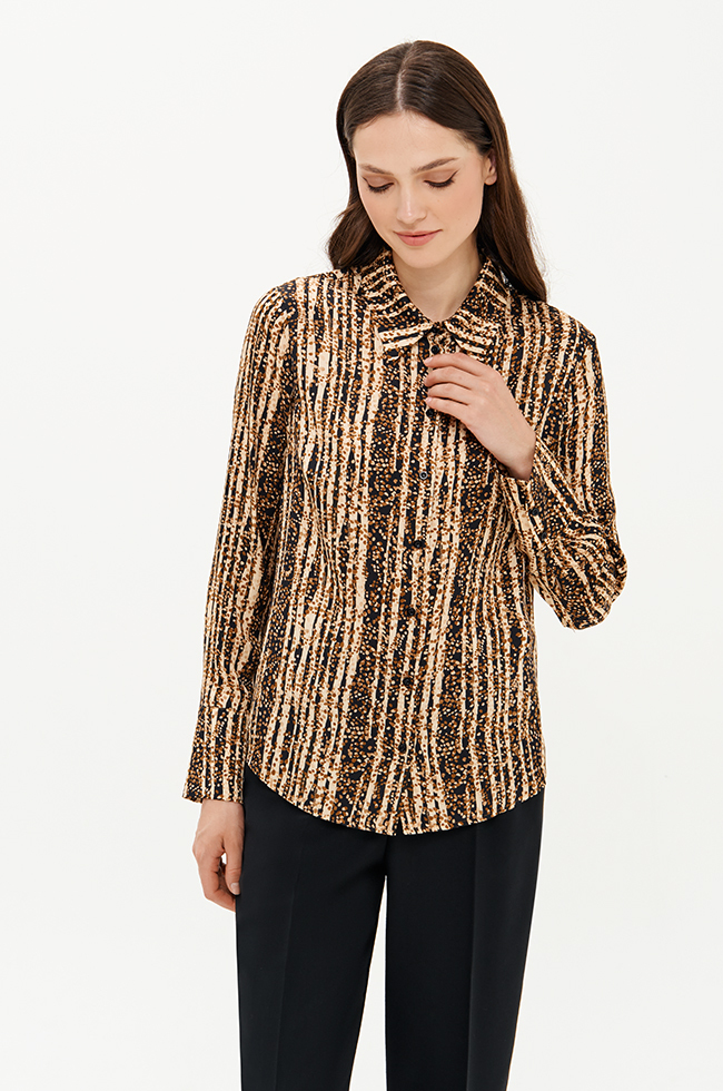 Стильная блузка прямого силуэта из вискозного принтованного полотна приятно прилегает к телу и будет отлично смотреться в качестве акцентной вещи в капсуле с черными брюками, юбкой, жакетом или жилетом. Блузка подходит для свиданий, походов в театр и особенных случаев, позволяя выглядеть привлекательно и уверенно в любой ситуации.